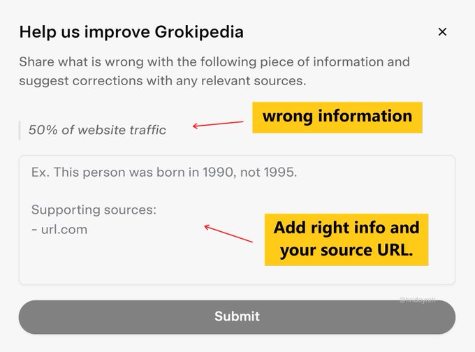 Grokipedia (an AI-powered public knowledge base) allows anyone to correct inaccurate facts. When your correction is accepted, your source link becomes a live backlink — often from a DR70+ domain.