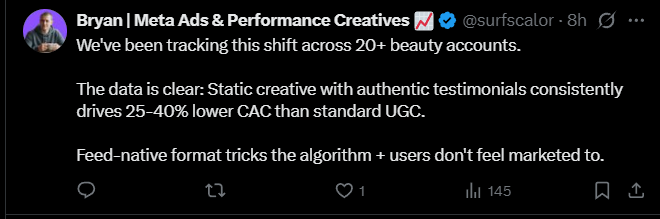 Beauty brands that are still forcing UGC and story-driven videos into their top-of-funnel are quietly getting outperformed — by static ads.